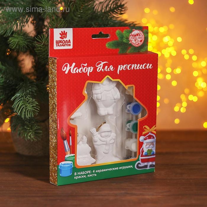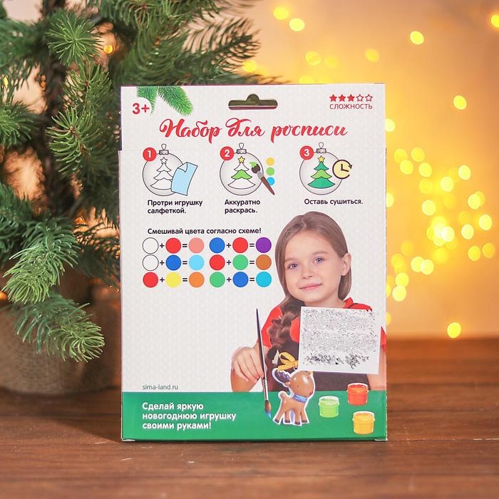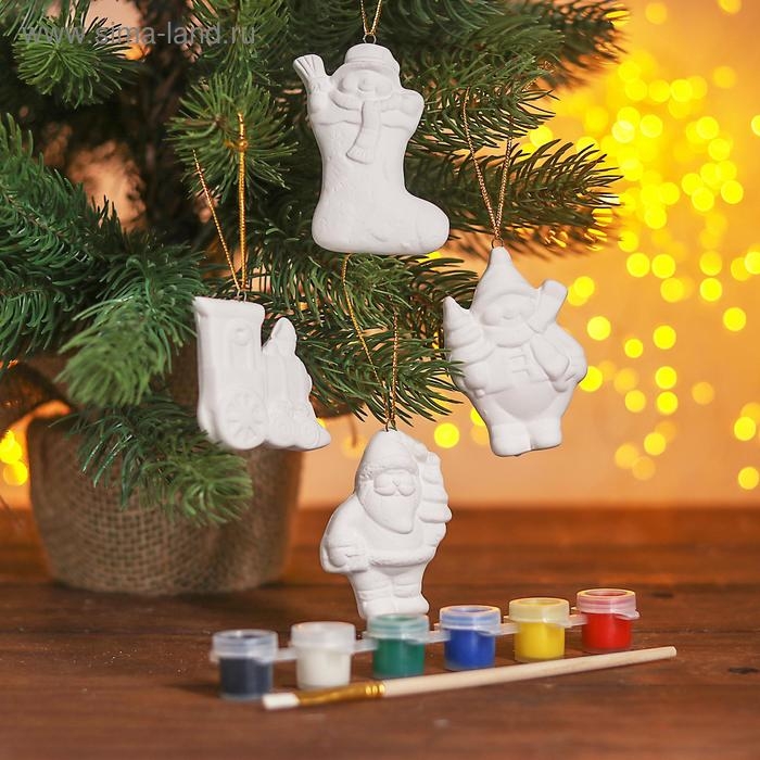 Набор ёлочных украшений под раскраску 4 шт. «Прелесть» с подвесом, краска 6 цв. по 2 мл, кисть