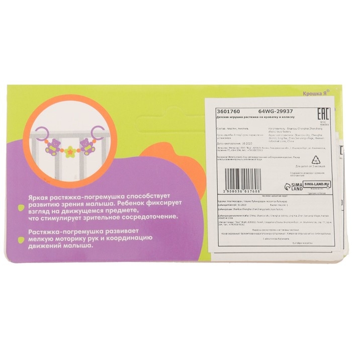 Эту подвеску можно закрепить на детской коляске или кроватке с помощью специальных колечек. Если покачать подвеску, она будет весело греметь. Сначала малыш научится фокусировать взгляд на разноцветных игрушках, а потом начнет тянуться к растяжке ручками и ножками. Такое изделие послужит крохе хорошим тренажером для развития тактильных ощущений, слухового и зрительного восприятия, а также внимания и способности различать цвета. Рекомендованный возраст +3 мес. Изделие изготовлено из пластика.