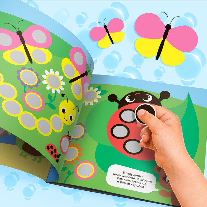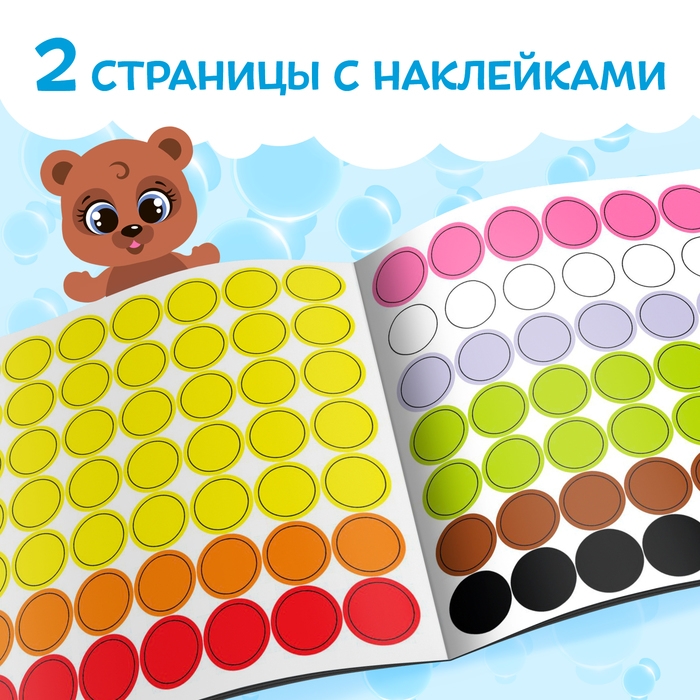 - Красочные картинки и милые персонажи подсказывают, куда именно нужно прикрепить наклейку-кружочек.