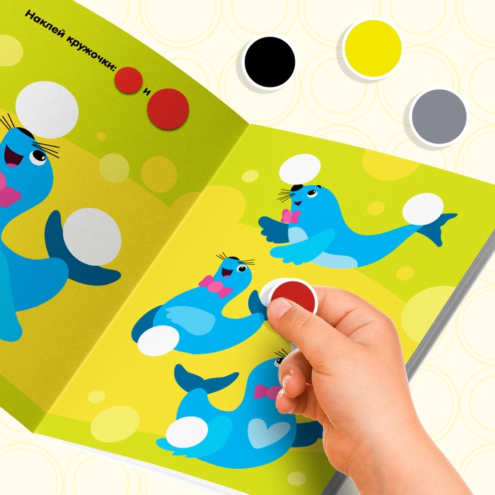 - Красочные картинки и небольшие подсказки сориентируют, куда именно нужно прикрепить наклейку-кружочек.