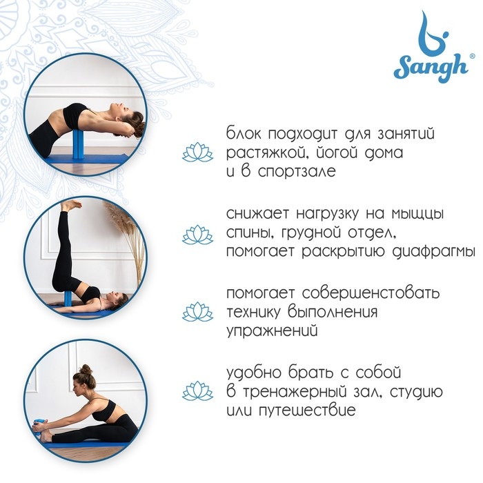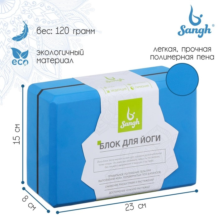 Блок для йоги Sangh, 23х15х8 см, цвет синий