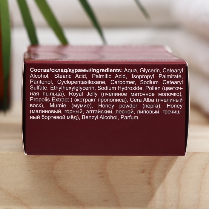 Состав: Aqua, Glycerin, Cetearyl Alcohol, Stearic Acid, Palmitic Acid, Isopropyl Palmitate, Pantenol, Cyclopentasiloxane, Carbomer, Sodium Cetearyl Sulfate, Ethylhexylglycerin, Sodium Hydroxide, Aqua with infusions of Pollen (цветочная пыльца), Royal Jelly (пчелиное маточное молочко), Propolis Extract (прополис), Cera Alba (пчелиный воск), Mumie (мумие), Mel Extract (перга), Honey (малиновый, горный, алтайский, лесной, липовый, гречишный мёд), Benzyl Alcohol, Parf.
