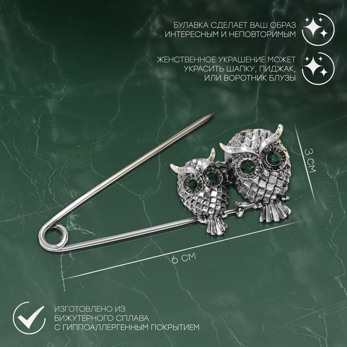 Данная булавка – настоящая находка для модниц, предпочитающих нетривиальные аксессуары. Брошь-булавка станет не только оригинальным дополнением вашего наряда, но и позволит без труда приколоть при необходимости палантин или шейный платок. Используйте её в качестве украшения шляпки, рубашки или галстука. Булавка «Совы» пара, 6 см, цвет зелёный в чернёном серебре внесёт особую нотку изящности в ваш образ.
