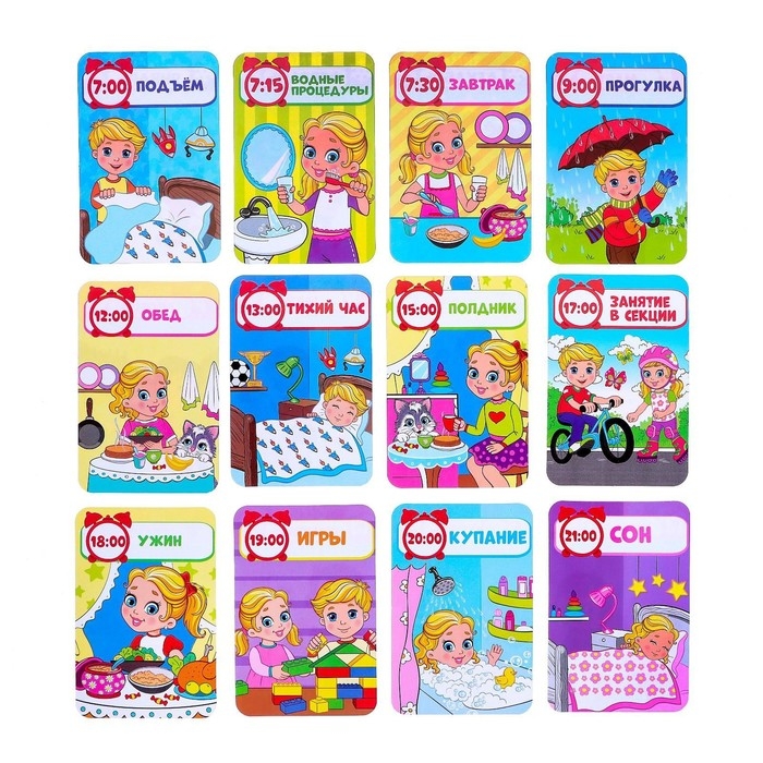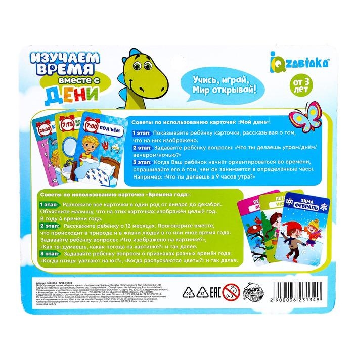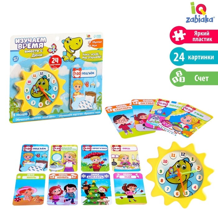 «Изучаем время» — развивающий набор для детей от 3 лет. С обучающими часиками ребёнок научится определять время, а с помощью ярких карточек узнает о распорядке дня, запомнит месяцы и времена года.