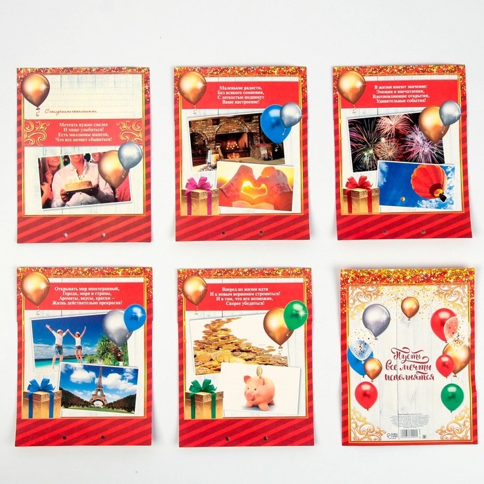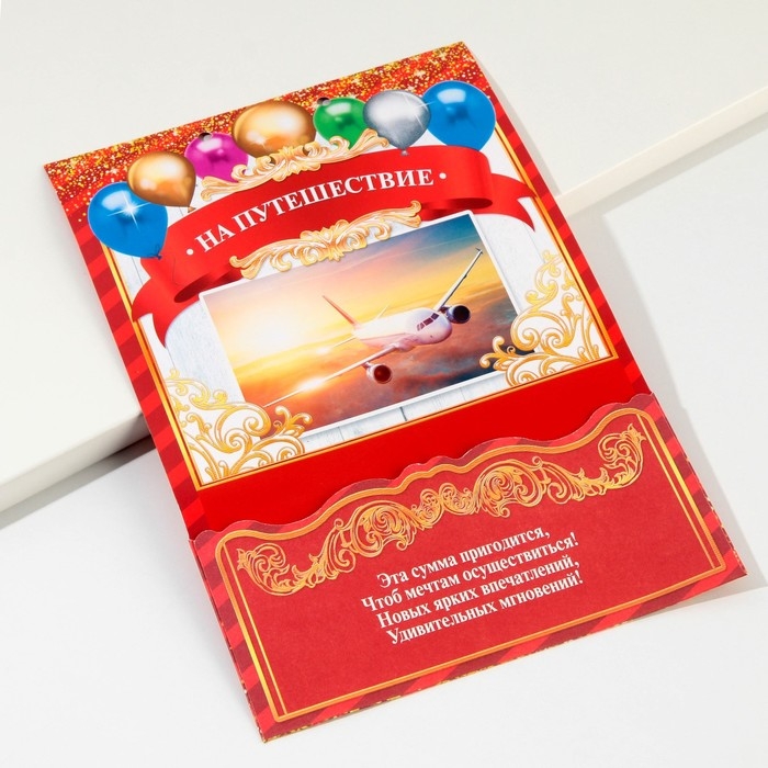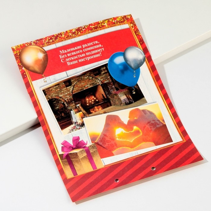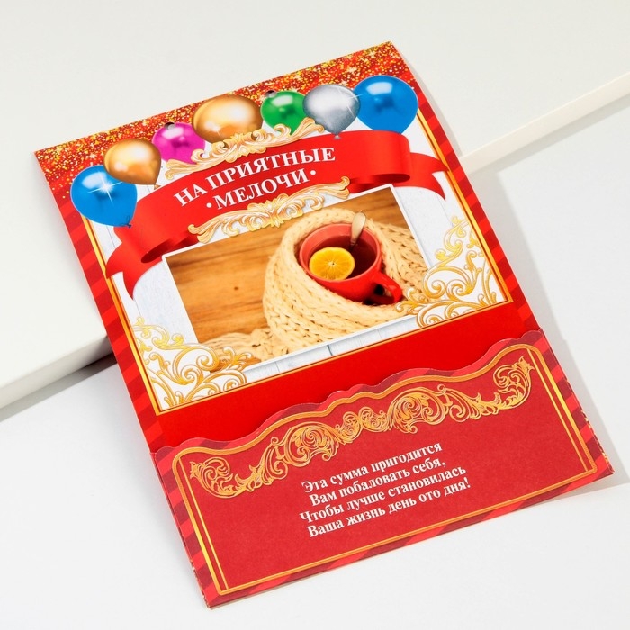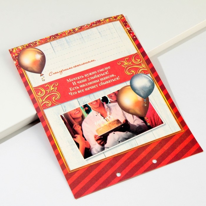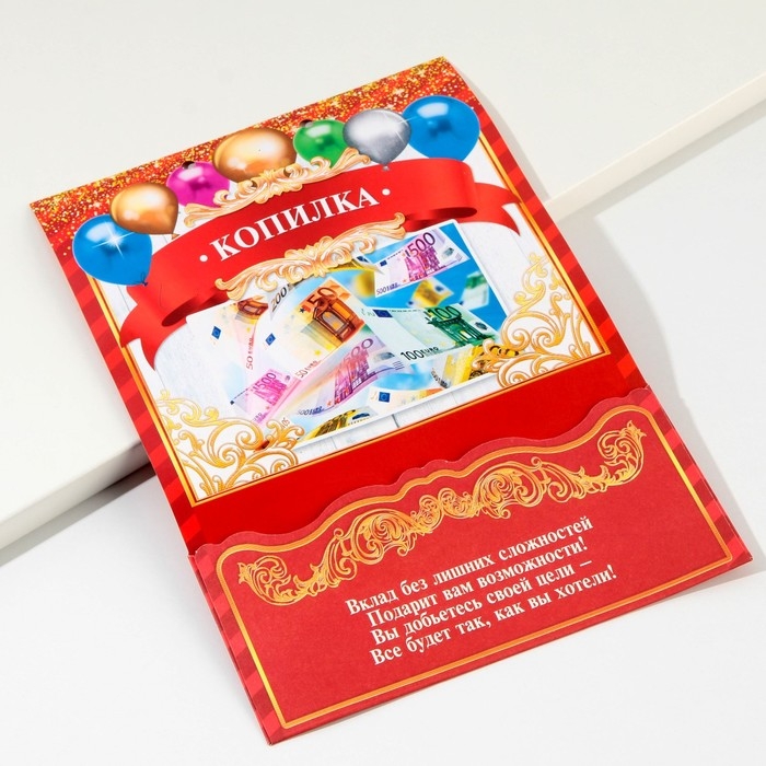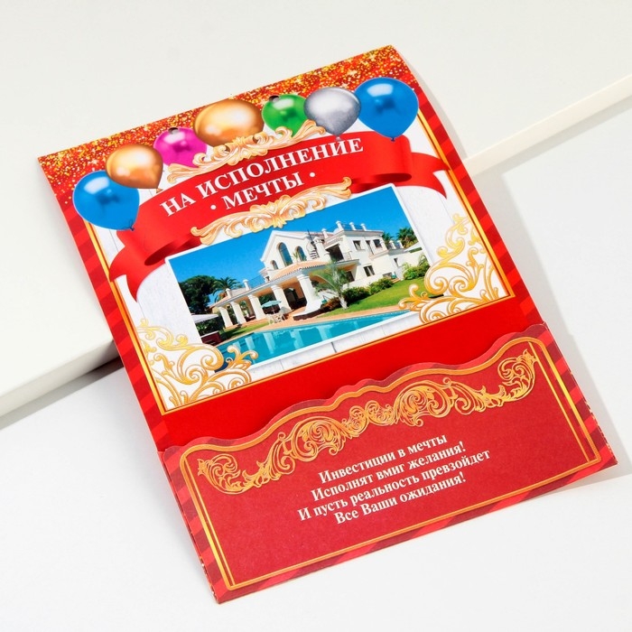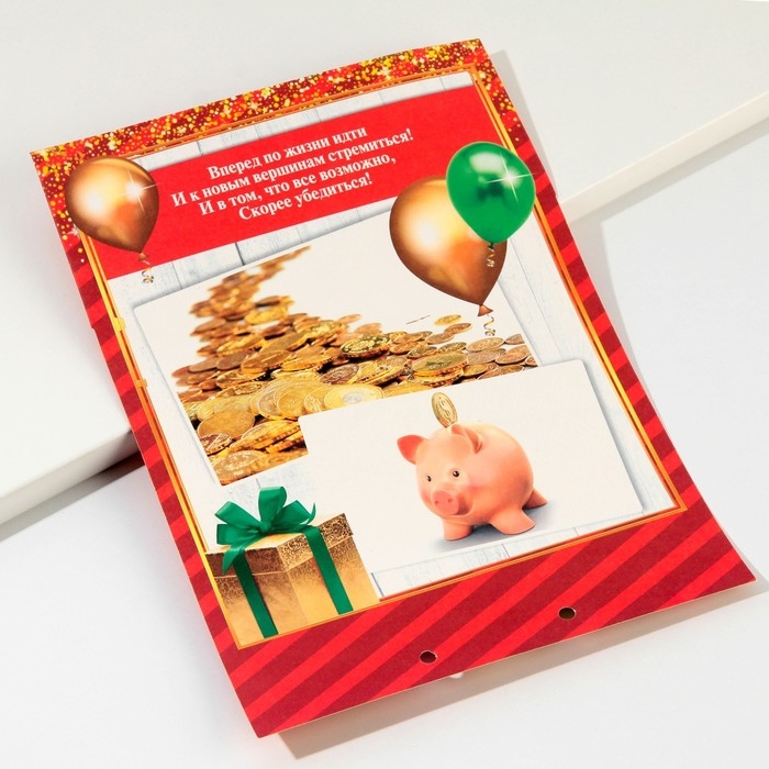 Дизайнерская открытка состоит из 5 листов, скреплённых лентой. На каждой странице с тёплыми пожеланиями располагается индивидуальный конверт. Положите внутрь банкноты — и мечты именинника станут явью.