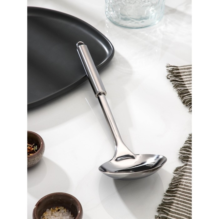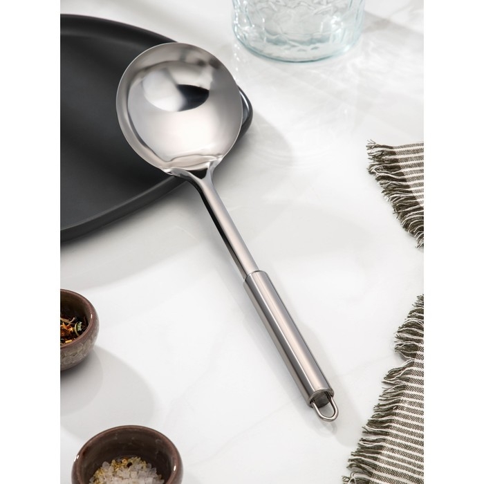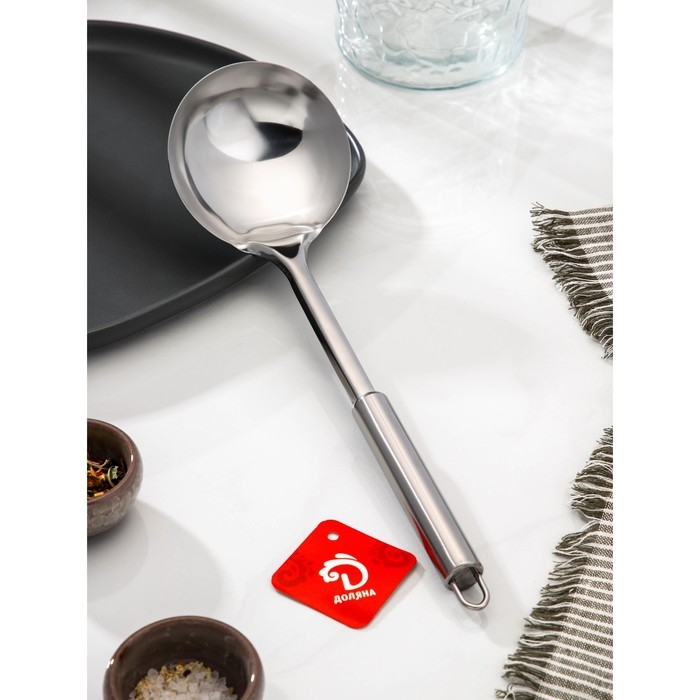 Половник из нержавеющей стали «Металлик» от Доляна — Эргономичная ручка обеспечивает комфортное использование, а петелька для подвешивания облегчает хранение. Этот половник станет отличным дополнением к вашей кухонной утвари и добавит стиля и функциональности вашему рабочему пространству.