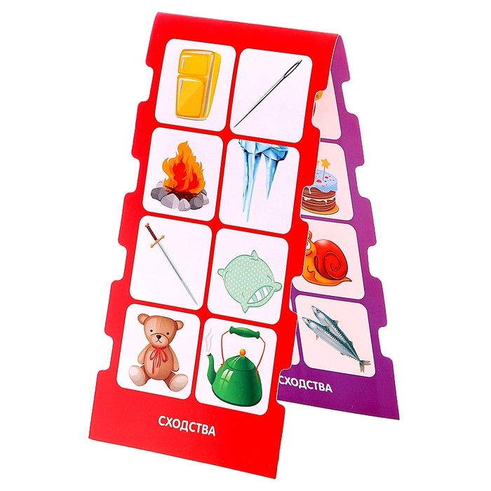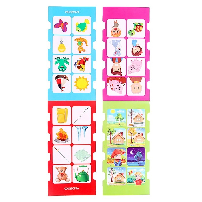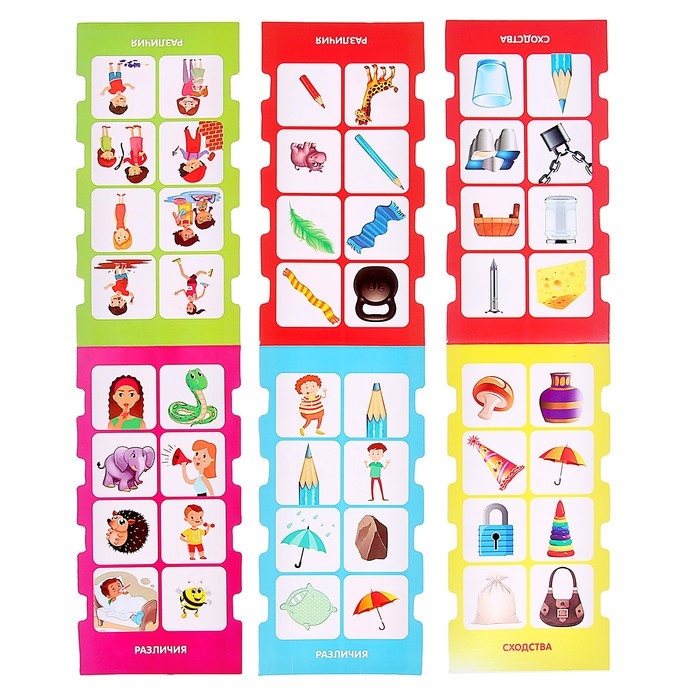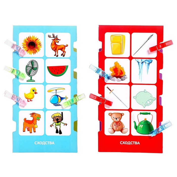 Ребёнку необходимо найти аналогию между предметами на картинках. Когда пара найдена, нужно обозначить её прищепками одного цвета. Можно искать различия, когда изображены одинаковые предметы или живые существа.