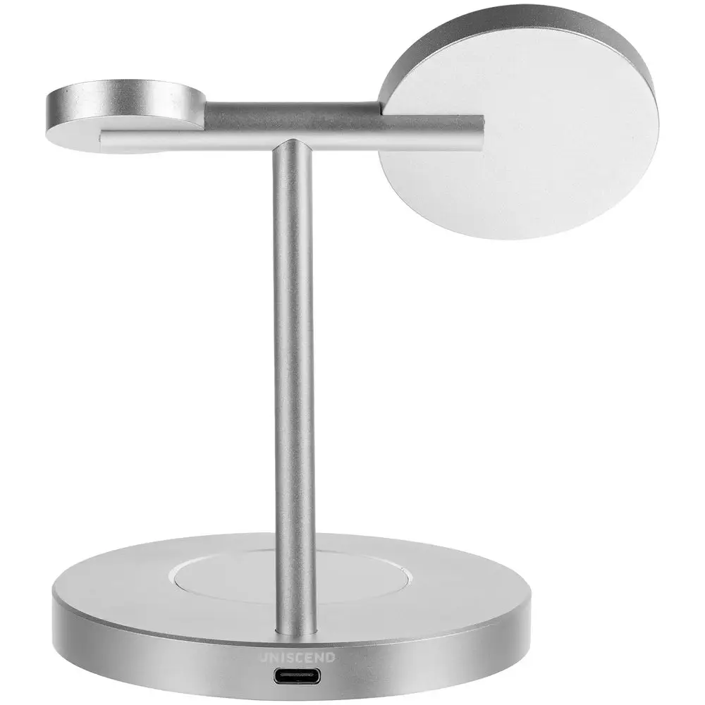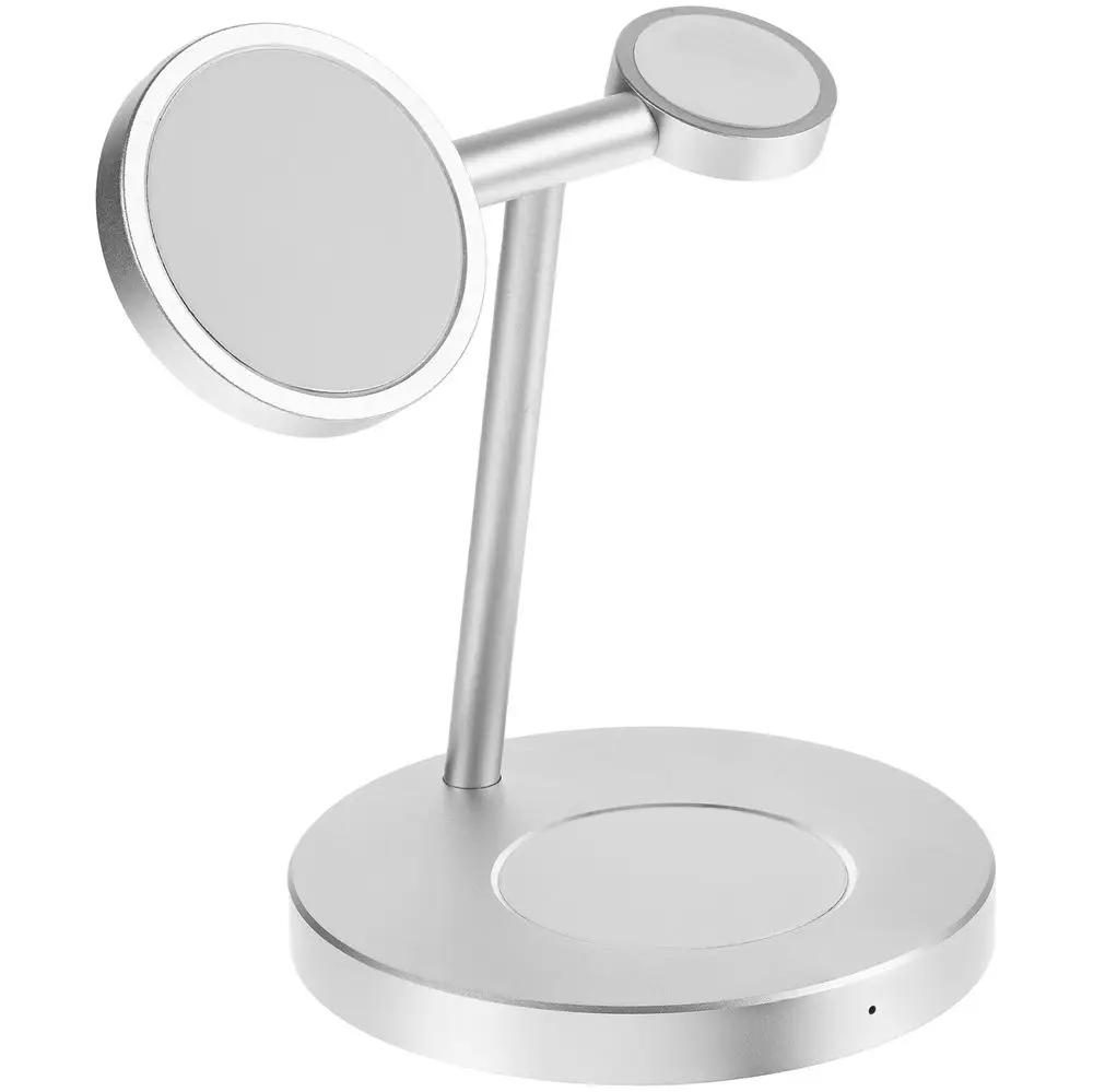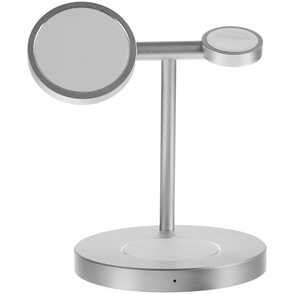 Станция может заряжать одновременно 3 устройства: беспроводные наушники с соответствующей функцией беспроводного заряда, смартфон, часы Apple Watch 2–8. Смартфоны iPhone 12–15 удерживаются на станции встроенными в их корпус магнитами. Прочие телефоны рекомендуем дополнить магнитным стикер-адаптером Magmate для надежного удержания на зарядной области.