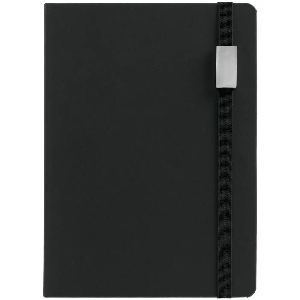 Ежедневник с твердой обложкой, выполнен из материала Latte, черный АА, обрез черного цвета, дополнен ляссе черного цвета и резинкой с металлическим шильдом.