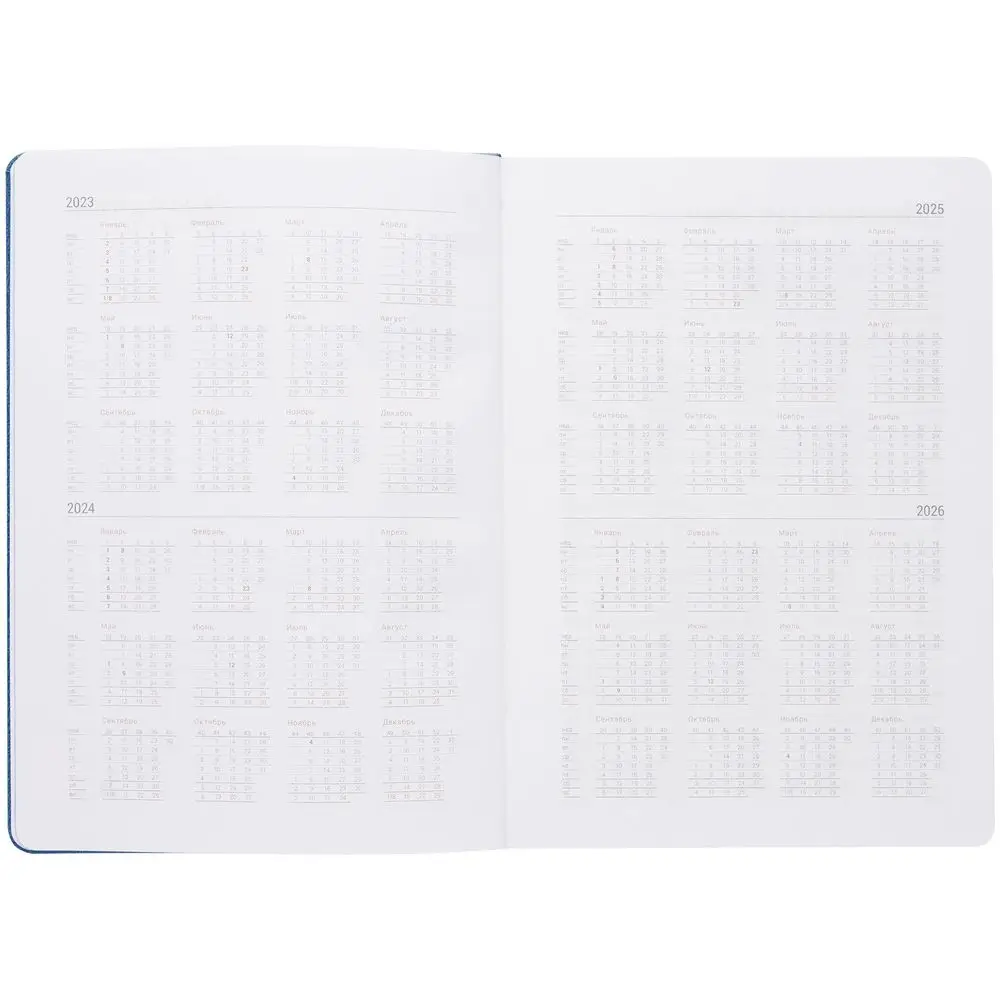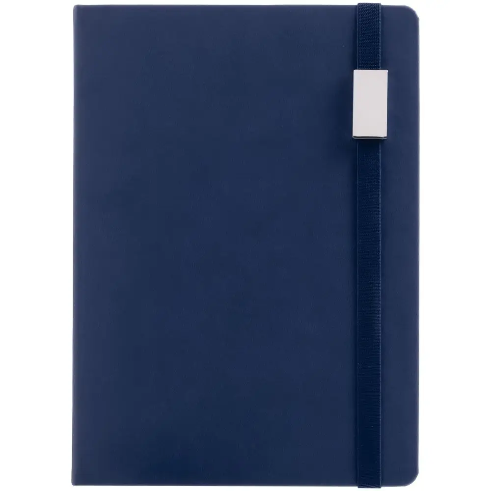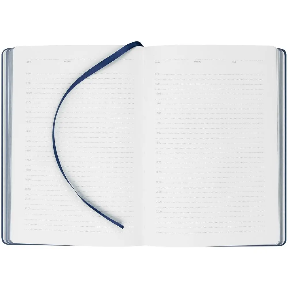 Ежедневник с твердой обложкой, выполнен из материала Latte, темно-синий ХХ, обрез темно-синего цвета, дополнен ляссе темно-синего цвета и резинкой с металлическим шильдом.