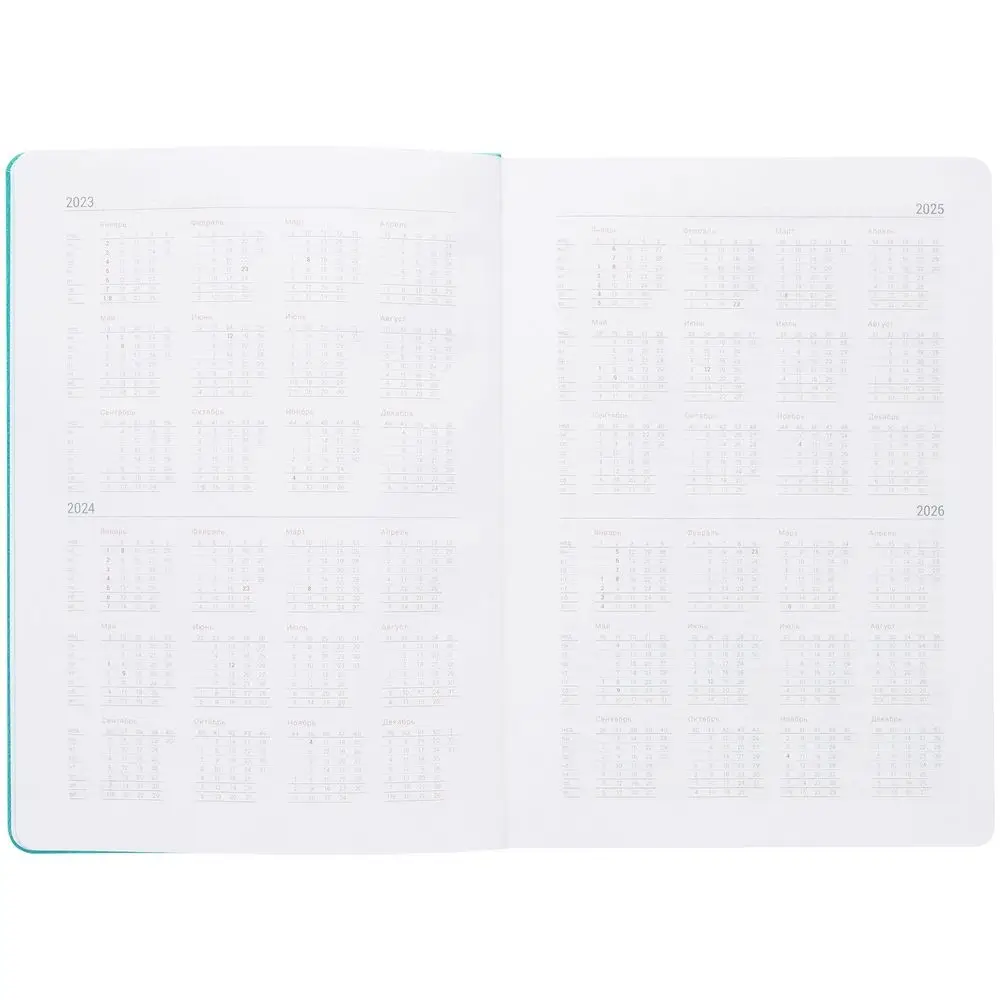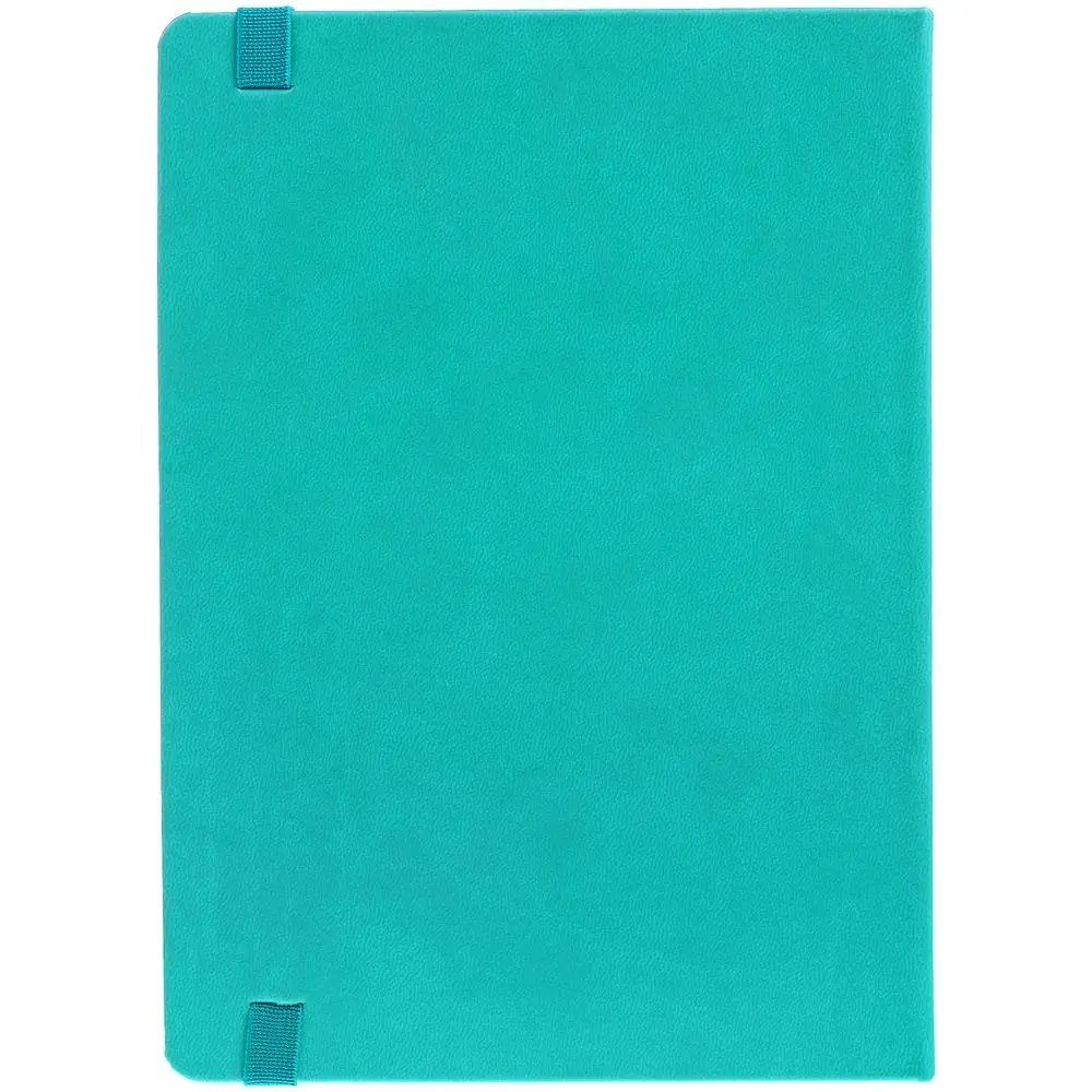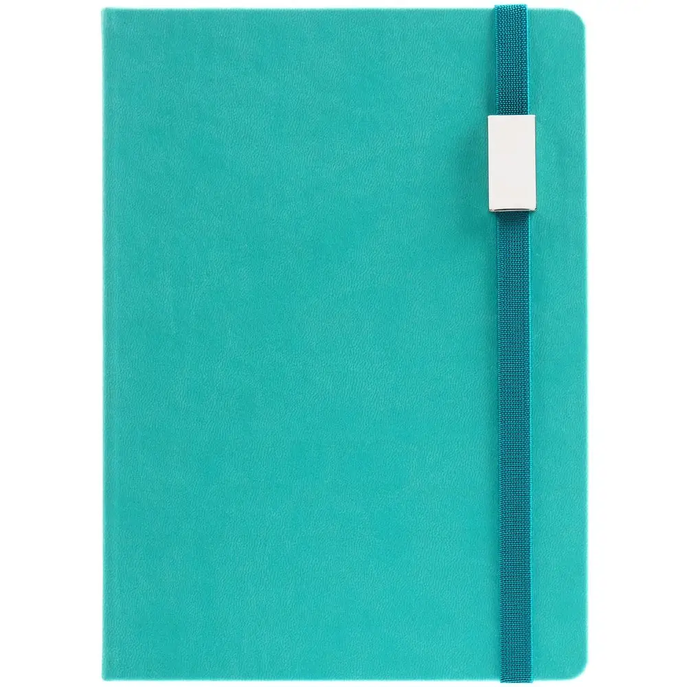 Ежедневник с твердой обложкой, выполнен из материала Latte, цвет морской волны II, обрез бирюзового цвета, дополнен ляссе бирюзового цвета и резинкой с металлическим шильдом.
