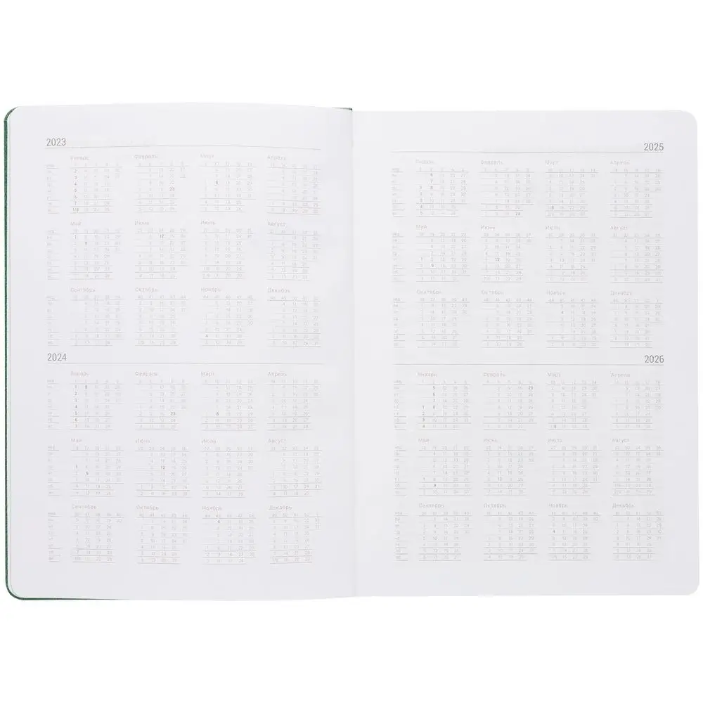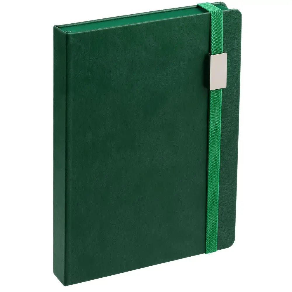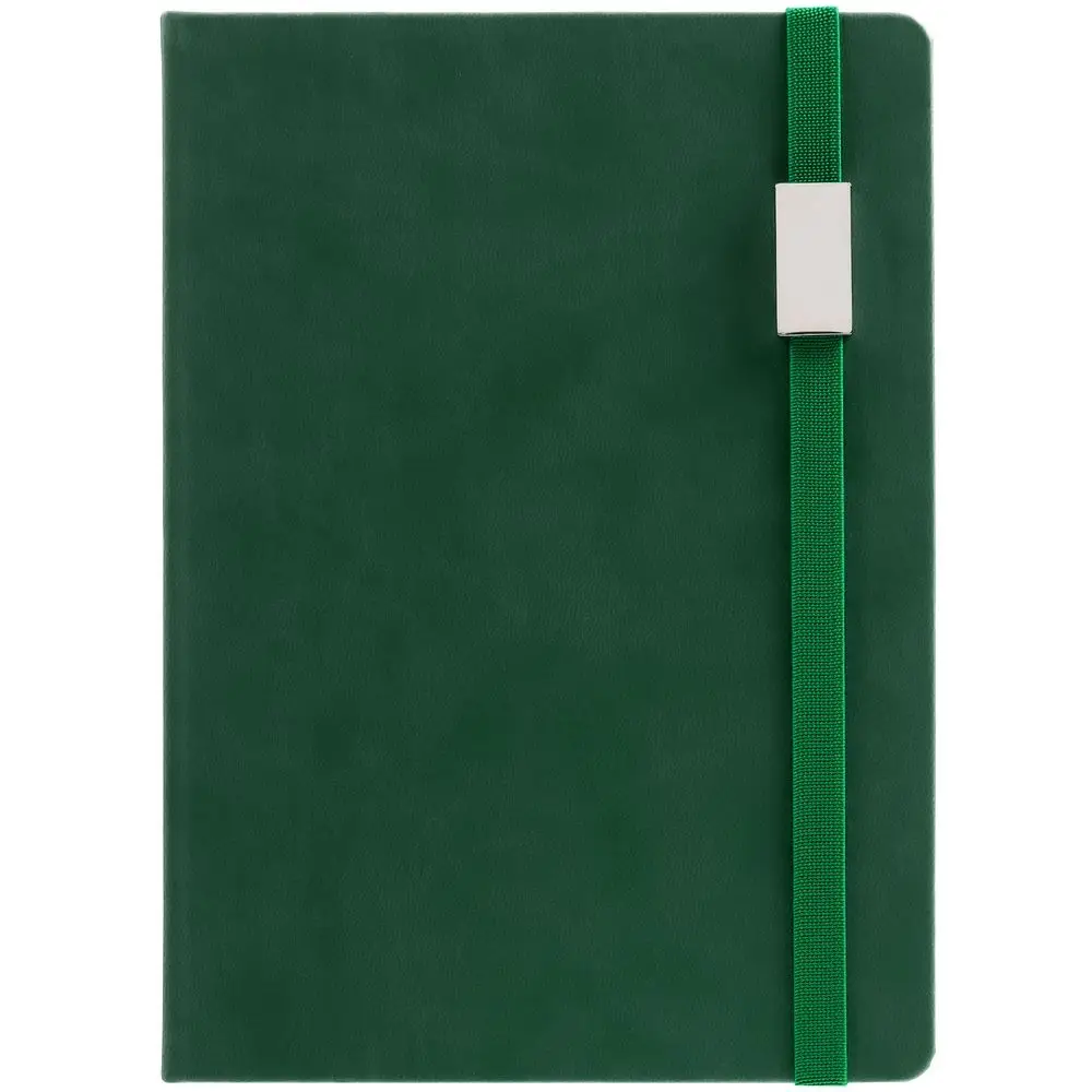 Ежедневник с твердой обложкой, выполнен из материала Latte, зеленый FF, обрез зеленого цвета, дополнен ляссе зеленого цвета и резинкой с металлическим шильдом.