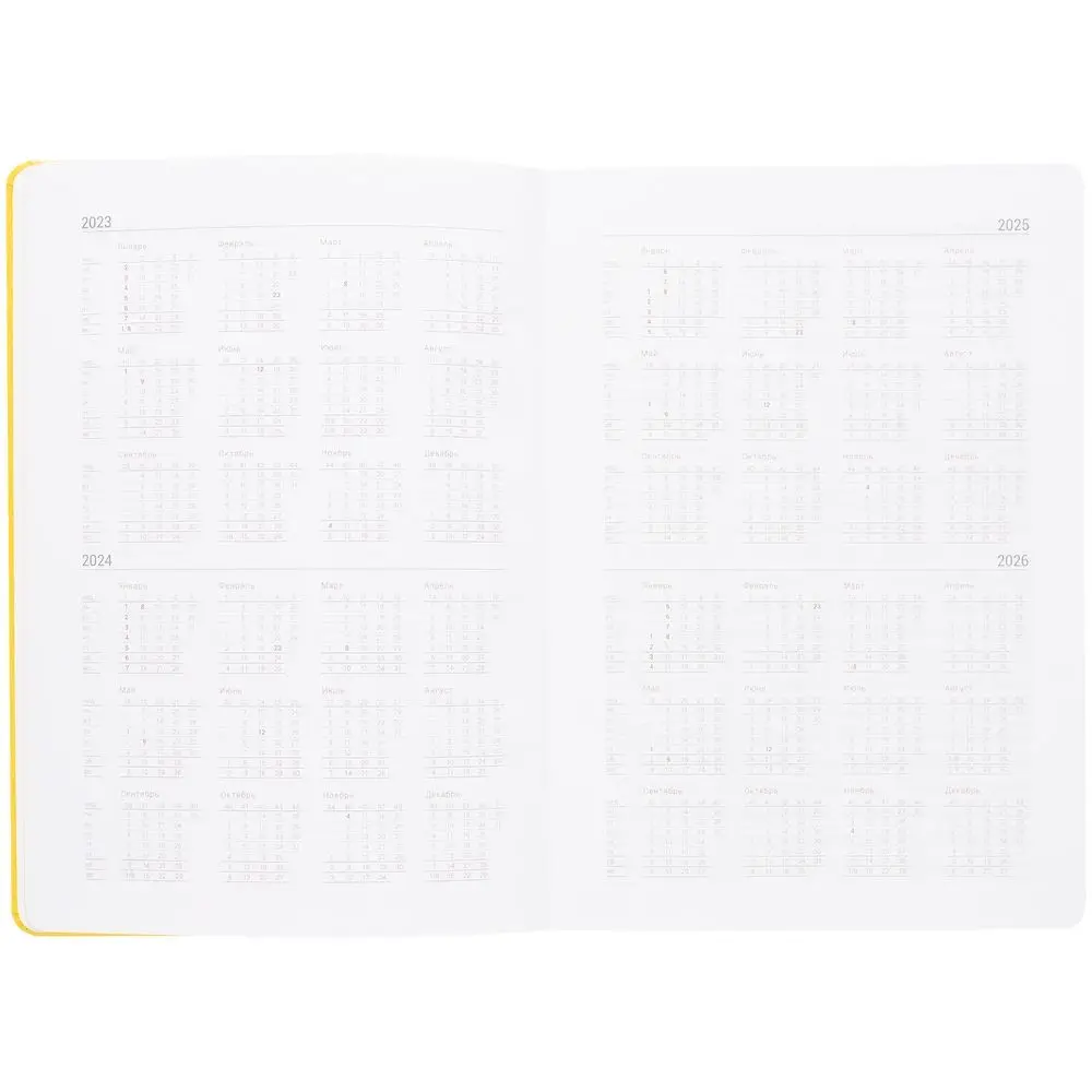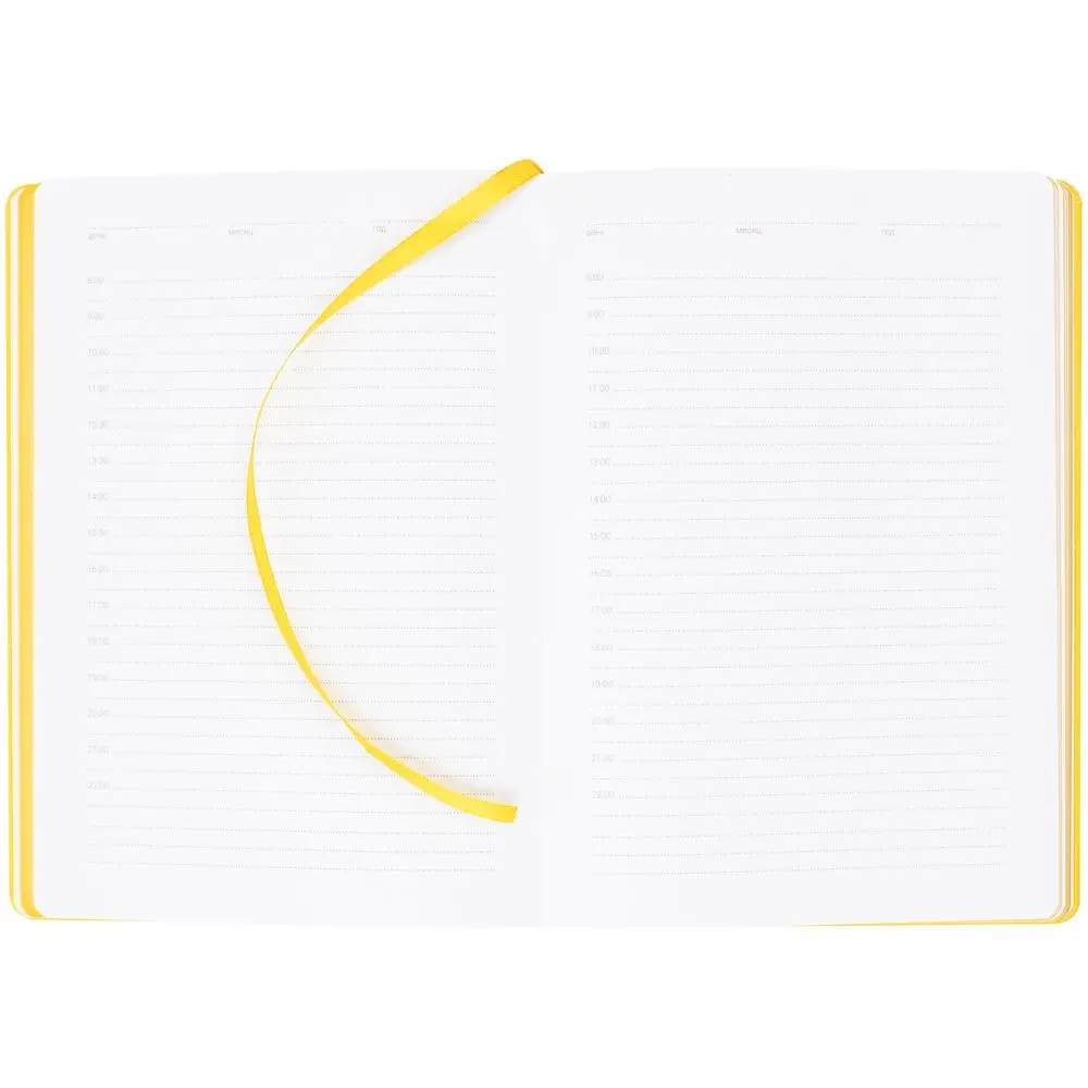 Ежедневник с твердой обложкой, выполнен из материала Latte, желтый КК, обрез зеленого цвета, дополнен ляссе желтого цвета и резинкой с металлическим шильдом.