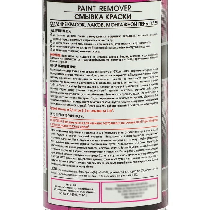 Средство наиболее эффективно в интервале температур от 0°С до +20°С. Эффективность резко падает под воздействием прямых солнечных лучей, на разогретых поверхностях. Перед применением средство тщательно перемешать интенсивным встряхиванием! Нанести на очищаемую поверхность без растушевки (без растирания и разглаживания) шпателем, щеткой, кистью слоем толщиной не менее 1,5-2,0 мм. Через 7-45 минут (время выдержки зависит от условий применения, толщины и природы покрытия) старую краску удалить металлической щеткой, шпателем, скребком либо другим вспомогательным инструментом (приспособлением). Поверхность промыть водой. При необходимости процедуру нанесения смывки повторить. Перед окрашиванием рабочую поверхность обезжирить. Для повышения эффективности смывающего действия рекомендуется накрыть поверхность с нанесенной на нее смывкой полиэтиленовой пленкой. Перед началом работы испытайте смывку на небольшом участке. Средний расход: от 0,5 кг до 1,0 кг смывки на 1 м².