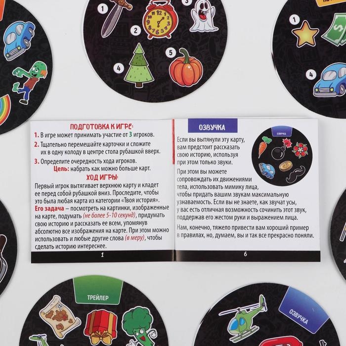 Игроки по очереди вытягивают карточки из колоды и кладут перед собой. Задача игроков – придумать любую историю и рассказать её всем, используя абсолютно все изображения на карте (а всего их 7). При этом можно использовать и любые другие слова, чтобы сделать историю интереснее.