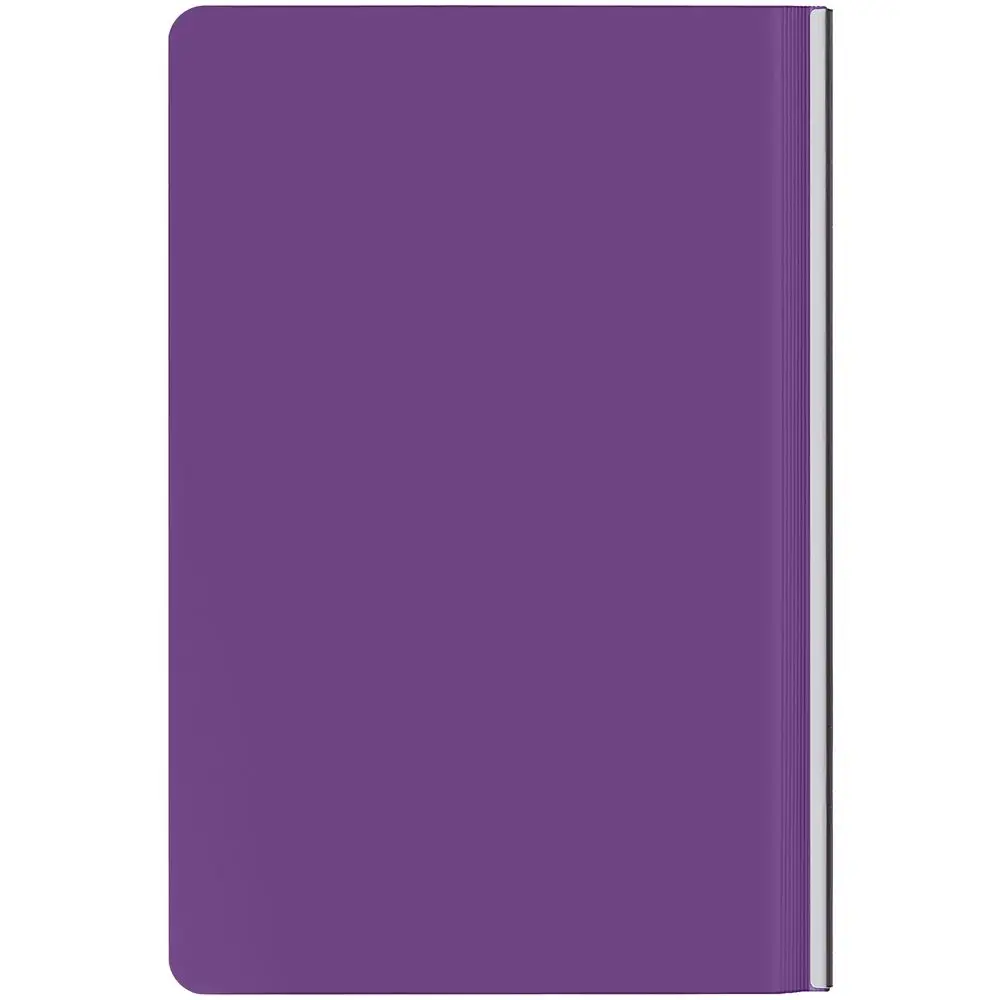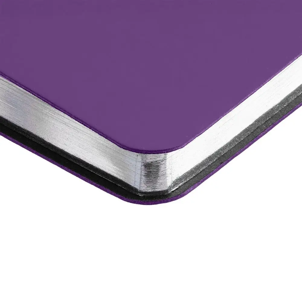 Ежедневник с гибкой обложкой и металлическим корешком, выполнен из материала Soft Touch, фиолетовый UU, дополнен серебристым обрезом блока и ляссе.