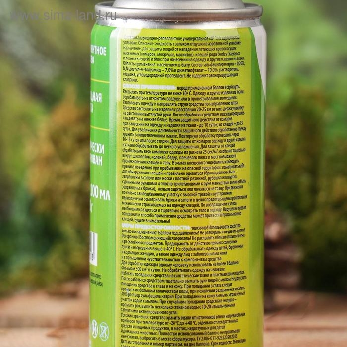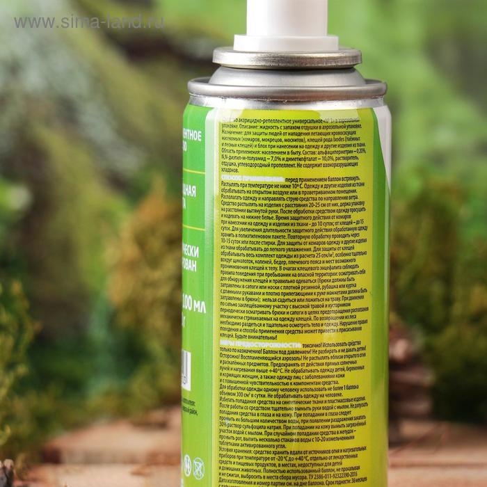 ОписаниеСредство инсектоакарицидно-репеллентное "Клещ-капут спрей". Для защиты людей от иксодовых клещей и блох (переносчиков возбудителей опасных заболеваний человека), а также от летающих кровососущих насекомых (комаров, мокрецов, москитов) при обработке одежды и других изделий из ткани.Применение: обрабатывать одежду на открытом воздухе (вне помещений). Располагать одежду и направлять струю средства по направлению ветра, средство распылять на изделия с расстояния 20-25 см от них, держа упаковку на расстоянии вытянутой руки из расчета 1 нажим на распылительную головку на участок 10 см х 10 см (1 кв.дм). Особенно тщательно обработать брюки вокруг щиколоток, голеней, коленей, бедер и мест возможного проникновения клещей и блох к телу. Одежду просушить и надеть на нижнее бельё. Повторную обработку одежды проводить через 10-15 суток или после стирки.Время защитного действия от клещей и блох до 15 суток, от летающих кровососущих насекомых до 10 суток, при условии хранения обработанной одежды в закрытом полиэтиленовом пакете.Нарушение правил поведения и способа применения средства может привести к присасыванию клещей.Меры первой помощи: при попадании в глаза - обильно промыть их водой, 2% раствором пищевой соды, закапать 30% раствор сульфацил натрия, при болезненности - 2% раствор новокаина. При случайном проглатывании - прополоскать рот водой. После этого выпить 1-2 стакана воды и и активированного угля (1 г на 1 кг веса). При ингаляционном отравлении вывести пострадавшего на свежий воздух, прополоскать рот водой. После оказания первой помощи обратиться к врачу.Меры предосторожности: токсично! Огнеопасно! Одному человеку использовать для обработки не более 1 флакона в сутки. Не обрабатывать одежду на человеке и не надевать ее до полного высыхания. Одежду для детей, беременных и кормящих женщин обрабатывают другие лица. Лицам с заболеваниями кожи и повышенной чувствительностью к химическим веществам применять средство с осторожностью. Избегать попадания средства в органы дыхания, рот, глаза и на кожу. После работы со средством тщательно вымыть руки с мылом. Избегать попадания средства на синтетические ткани и пластмассовые изделия.Хранить при температуре от -20°C до +40°C, отдельно от лекарственных средств и пищевых продуктов, в недоступном для детей месте. Беречь от нагрева и влаги. Не допускать попадания средства в сточные, поверхностные или подземные воды и в канализацию.СоставСостав средство от насекомых: альфациперметрин (0,23%), N,N-диэтилтолуамид (10%), спирт изопропиловый (84,17%), функциональные добавки.