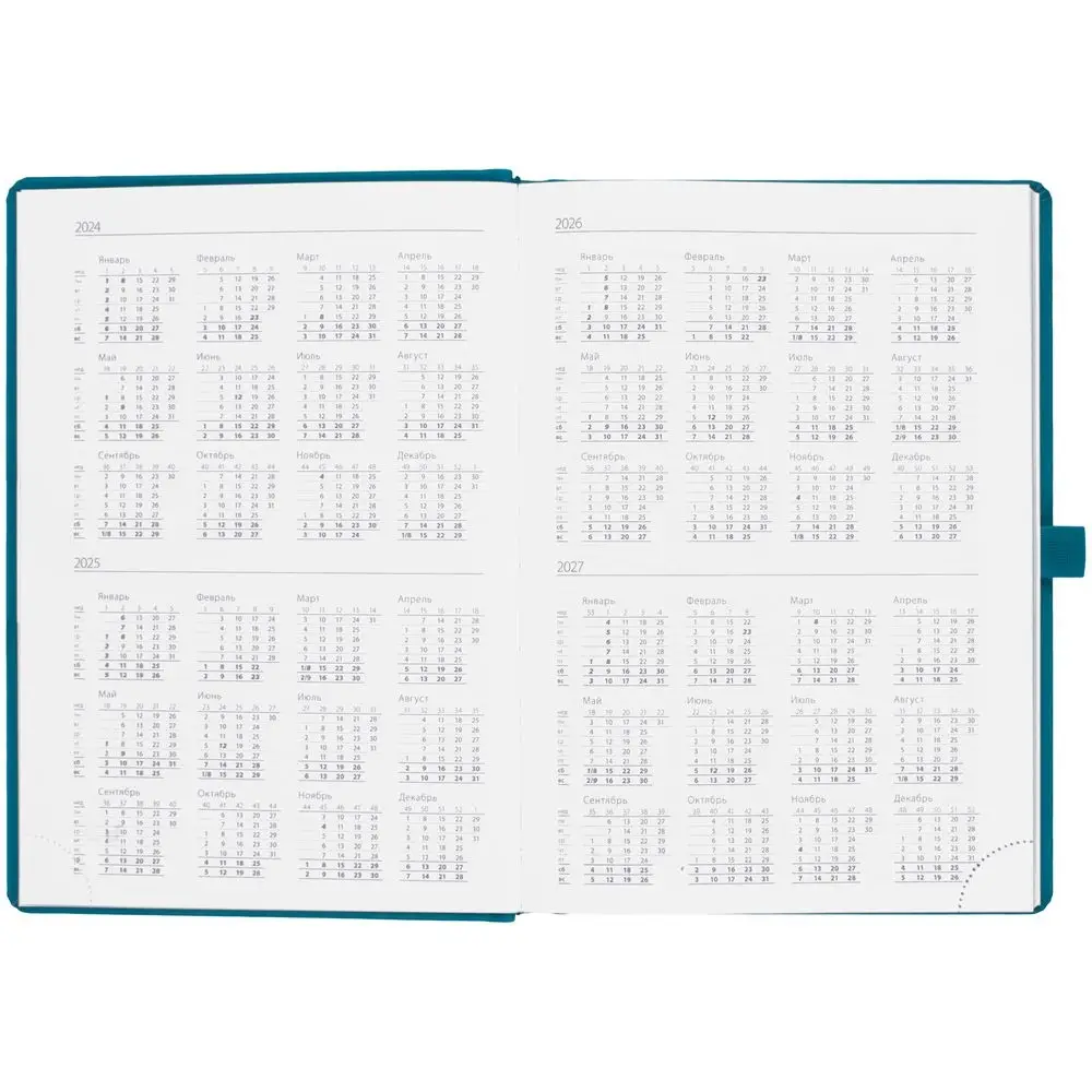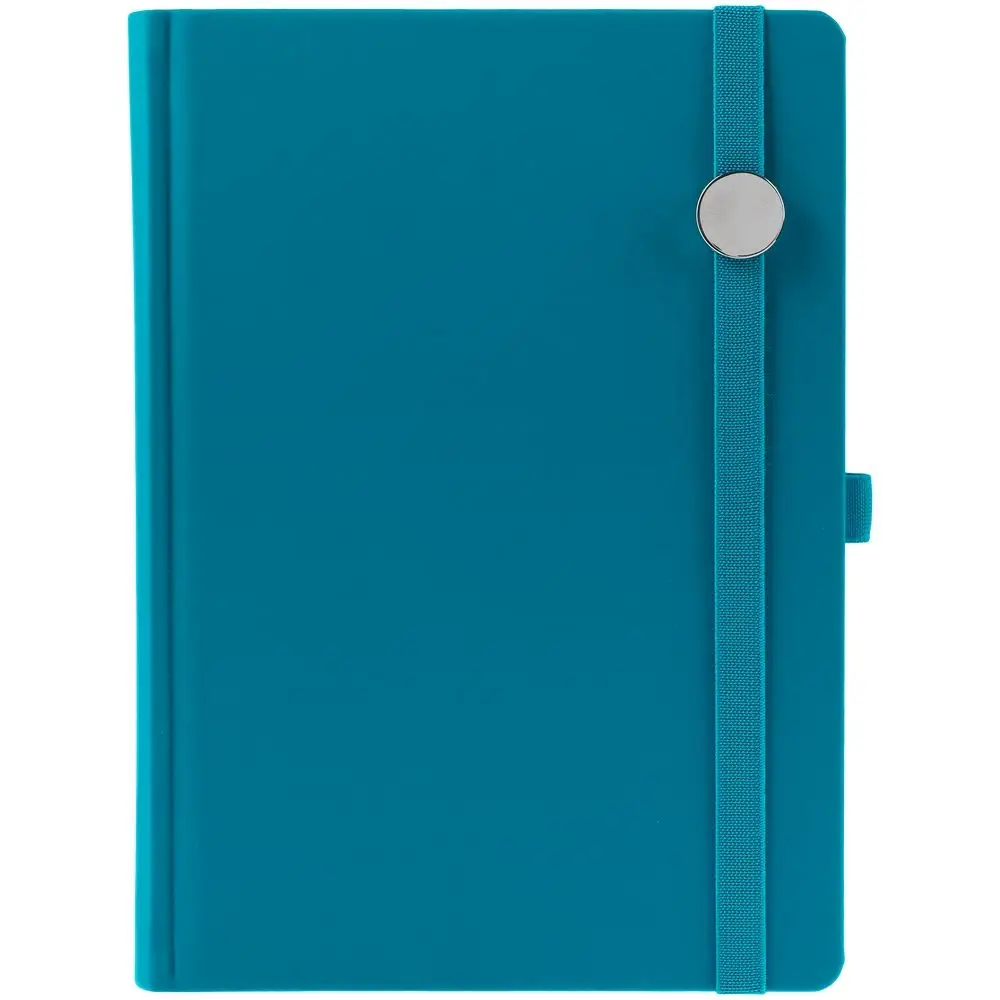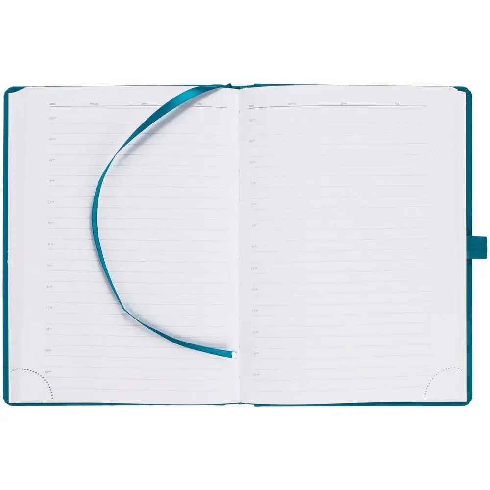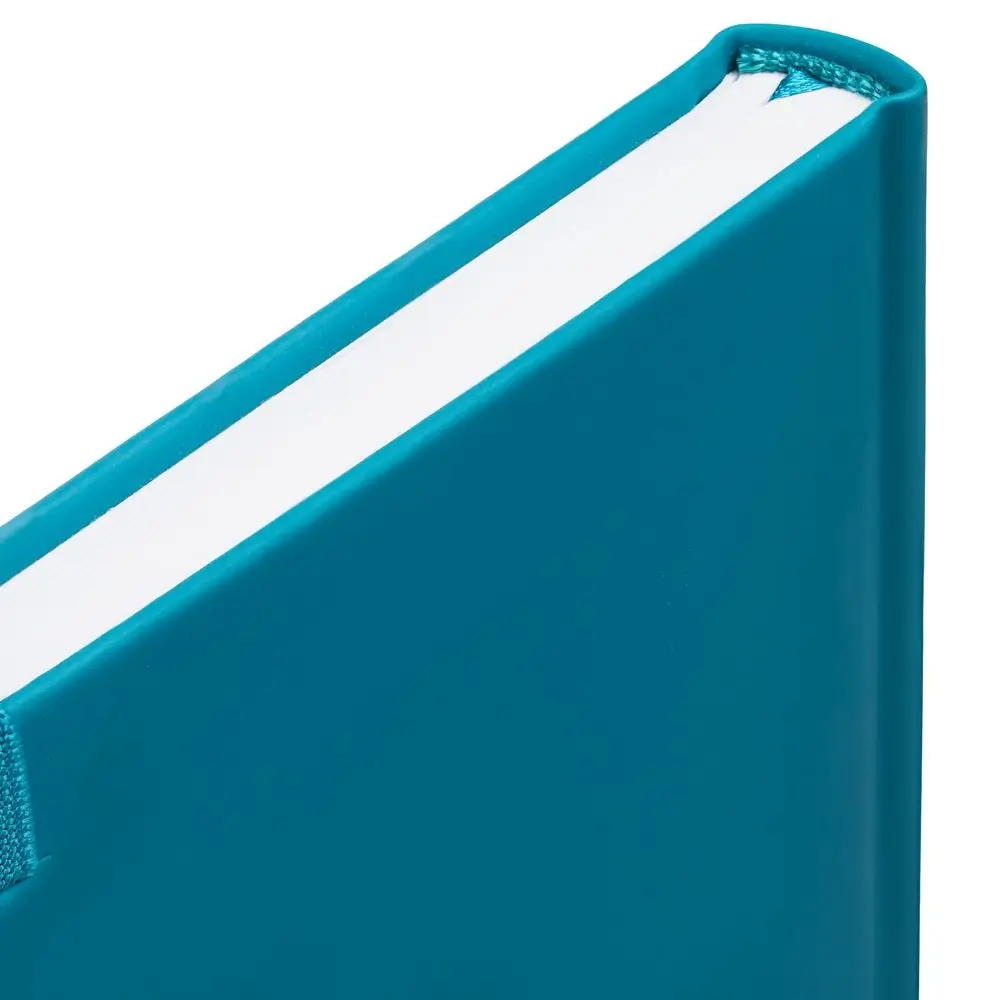 Ежедневник с твердой обложкой без поролона, выполнен из материала Soft Touch, цвет морской волны II, дополнен резинкой шириной 1 см, петлей-резинкой для ручки, капталом и ляссе темно-бирюзового цвета.