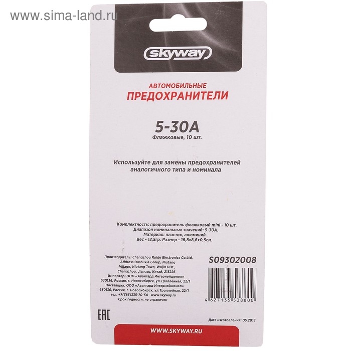 Предохранитель флажковый Skyway, "мини", 5-30 А, блистер, набор 10 шт