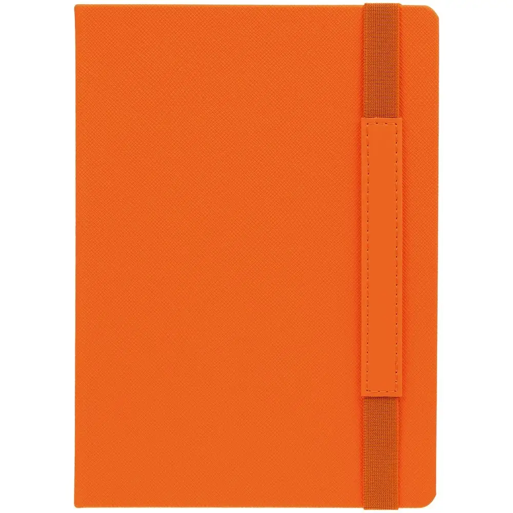 Ежедневник с твердой обложкой, выполнен из материала Nice Touch, оранжевый ОО, дополнен резинкой с лейблом из материала Soft Touch и ляссе в цвет обложки.