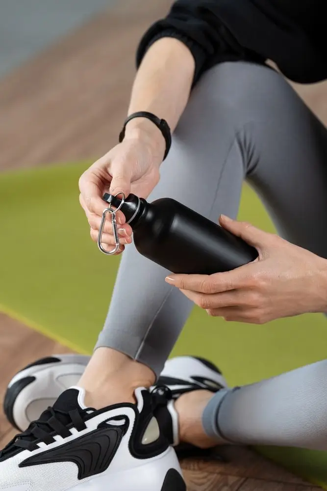 Бутылка классической формы с плотно завинчивающейся крышкой. Можно пристегнуть к рюкзаку или сумке, а также закрепить на карабине ключ от шкафчика на время тренировки.