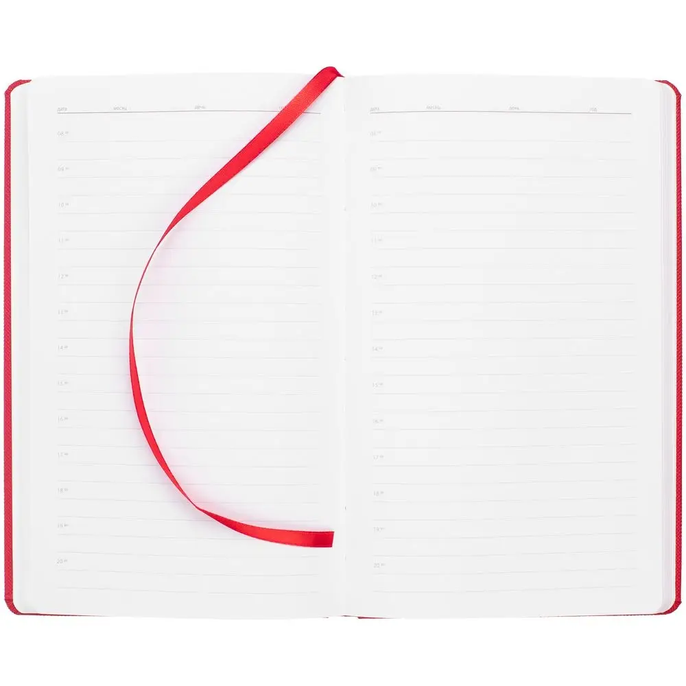 Ежедневник с твердой обложкой, выполнен из материала Canyon, красный РР, дополнен ляссе в цвет обложки.