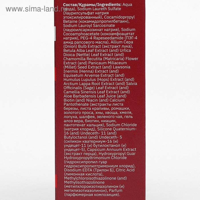 Состав: вода, лаурилсульфат натрия этоксилированный, кокамидопропилбетаин, лауроилсаркозинат натрия, кокоамфоацетат натрия, ПЭГ-4 амид рапсового масла, экстракт лука, экстракт листа березы, экстракт листа крапивы, экстракт цветков ромашки, экстракт семян проса, экстракт хвоща, экстракт корней лопуха, экстракт листьев шалфея, экстракт листьев зеленого чая, гель алоэ вера, биотин, ниацин, пантотенат кальция, натрия хлорид, силикон кватерниум-16 (и) ундецет-11 (и) бутилоктанол (и) ундецет-5, экстракт красного перца, гидроксипропил гуар гидроксипропилтримониум хлорид, трилон Б, лимонная кислота, метилхлороизотиазолинон (и) метилизотиазолинон, парфюмерная композиция, краситель Cl15985.