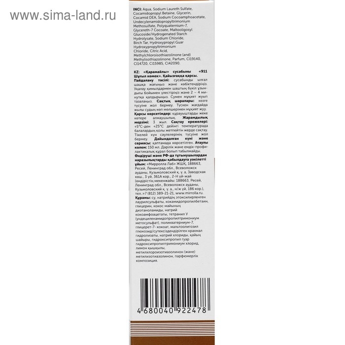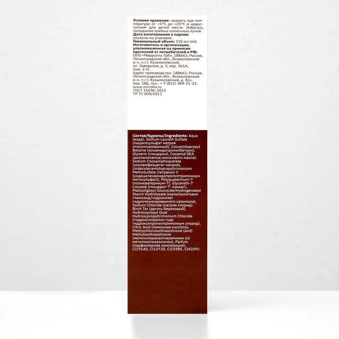 Состав: вода, лаурилсульфат натрия этоксилированный, кокамидопропилбетаин, глицерин, диэтаноламид кокосового масла, кокоамфоацетат натрия, тетранил У (ундециленамидопропилтримониум метосульфат), поликватерниум-7, глицерет-7- кокоат, мальтоолигозил глюкозид/гидролизат гидрогенизированного крахмала, натрия хлорид, деготь березовый, гидроксипропил гуар гидроксипропилтримониум хлорид, лимонная кислота, метилхлороизотиазолинон (и) метилизотиазолинон, парфюмерная композиция, красители Cl19140, Cl14720, Cl15985, Cl42090.