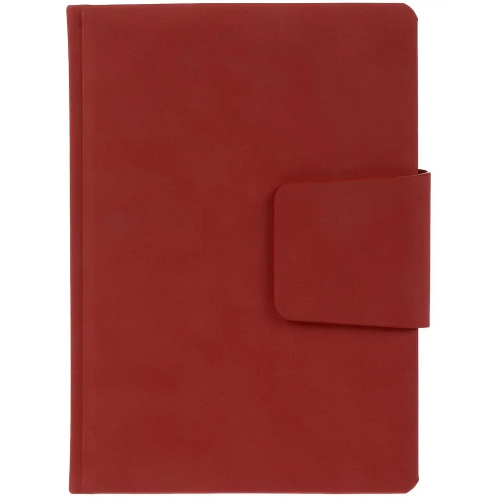 Ежедневник с твердой обложкой c поролоном, выполнен из материала Nubuck, красный РР, дополнен капталом и ляссе в цвет обложки. Застежка — хлястик на магните.