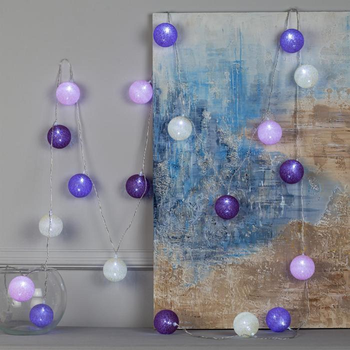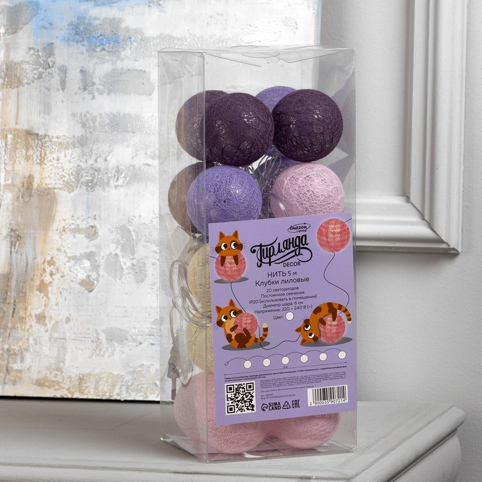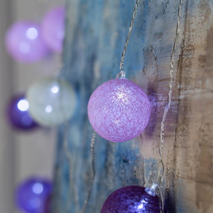 Гирлянда «Нить» 5 м с насадками «Клубки лиловые», IP20, прозрачная нить, 20 LED, свечение белое, 220 В