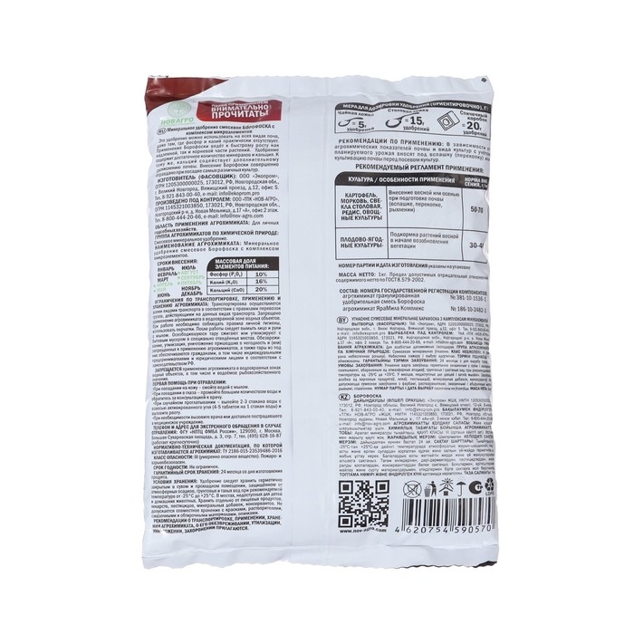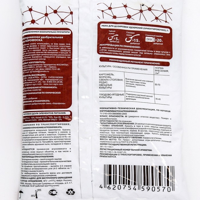 Способ применения: В зависимости от агрохимических показателей вносят под вспашку или культивацию почвы перед посевом: 60-70г на 1кв.м под зерновые и зернобобовые культуры, многолетние и однолетние травы, лен. 100-110г на 1кв.м под кукурузу, кормовые культуры, сахарную свеклу, картофель и овощи.