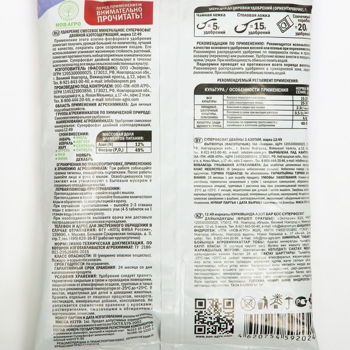 Способ применения: Основное внесение при перекопке почвы осенью или весной в открытом грунте 15-20 г/м2 на окультуренных почвах, 25-30 г/м2 - на неокультуренных почвах: В парниках и теплицах - 20-25 г/м2, при посадке плодово - ягодных и декоративных деревьев и кустарников - 80-200 г на посадочную яму. Местное внесение - при посеве 2-3 на метр рядка или 0,5-1,0 г в лунку при посадке картофеля и рассады с последующим перемешиванием с землёй. Овощные и цветочные 2-3 раза в период вегетации из расчета 20-30 г на 10 м2 в сухом виде водного раствора, растворив в 10 л.