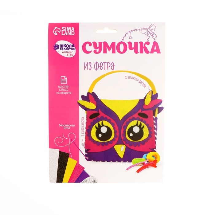 Ваша маленькая модница будет в восторге, ведь теперь она сама сможет стать дизайнером сумки и сшить ее! Выберите понравившийся набор и вместе с малышом создайте сумочку из фетра. Если вам кажется это сложным для ребенка, то спешим уверить в обратном, все просто! Ведь такой набор предусмотрен для детей от 3 лет, у сумки есть перфорация и клеевой фетр, она легко сшивается пластиковой иглой. Материалы безопасны для ребенка, чтобы выполнить такую поделку, достаточно следовать инструкции на обороте.
