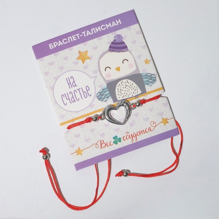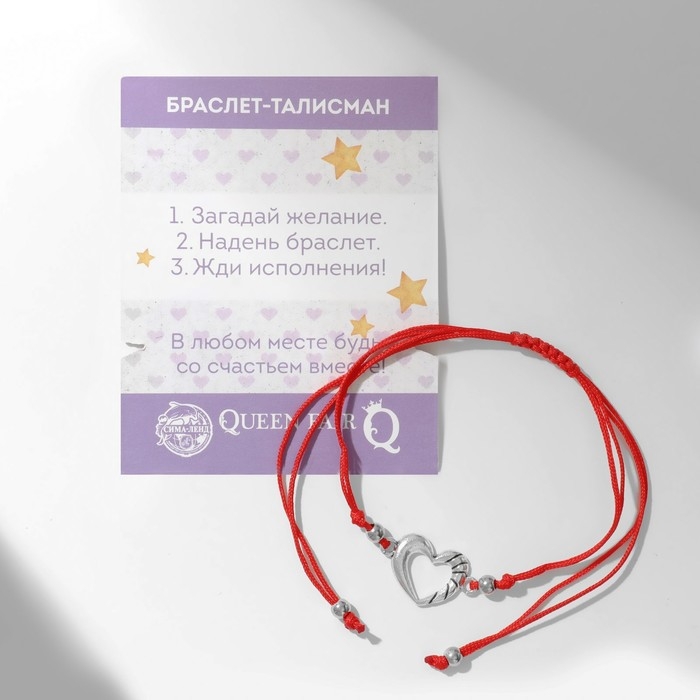 Браслет-оберег «Красная нить» на счастье, сердечко, цвет серебро, d=5,5 см