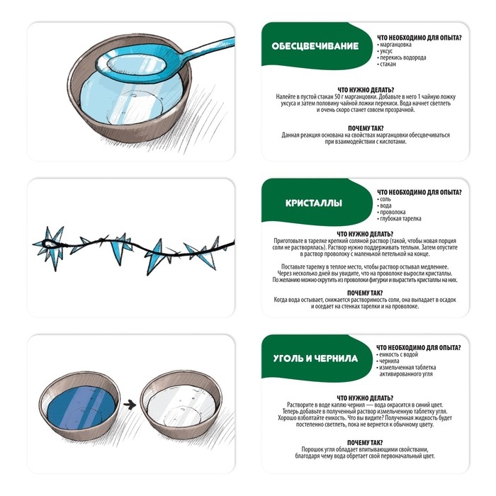Вместе с ребёнком выберите карточку с опытом. На одной её стороне прописаны все составляющие, процесс опыта и что должно получиться. Есть научное объяснение, почему так происходит. На другой стороне карточки нарисована картинка, изображающая процесс проведения опыта или его результат.
