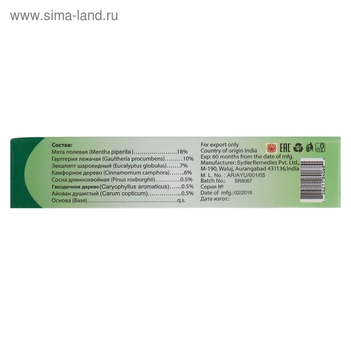 Состав: Мята полевая - 18%; Гаултерия лежачая - 10%; Эвкалипт шаровидный - 7%; Камфорное дерево - 7%; Сосна длиннохвойная - 0,5%; Гвоздичное дерево - 0,5%; Айован душистый - 0,5%; Основа - q.s.