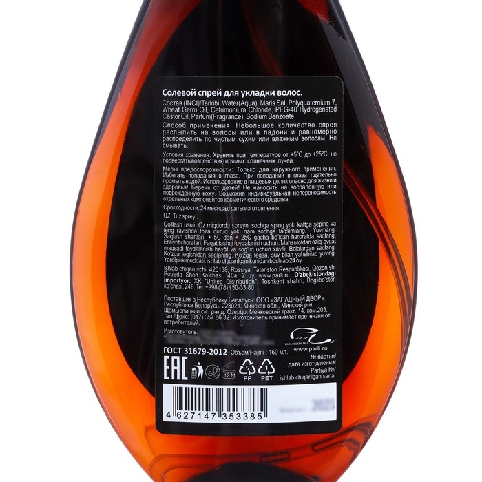 Состав: Water(Aqua), Polyquaternium-16, Cetrimonium Chloride, Maris Sal, PEG-40 Hydrogenated Castor Oil, DMDM Hydantoin, Potassium Sorbate, Sodium Benzoate, Magnesium Sulphate Heptahydrate, Parfum(Fragrance), Citric Acid.