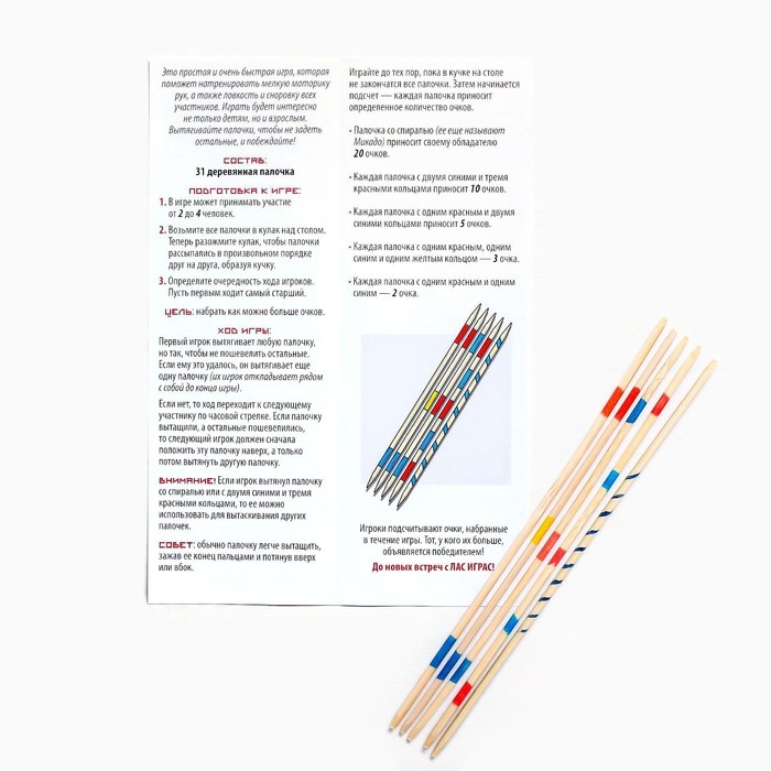 «Тише-тише…», «вытягивай осторожно!», «фух!» — эти и похожие выражения будет периодически говорить каждый из вас. А почему? Да потому, что в этой игре нужно вытягивать одни палочки так, чтобы не задеть остальные. Для этого вам понадобится ловкость рук, сноровка и немного хитрости! Самое главное — играть будет интересно и детям, и взрослым!