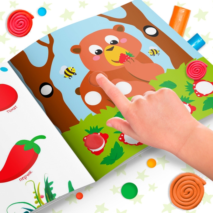 Книга для аппликации пластилином направлена на развитие моторики, внимательности и аккуратности у малышей.
