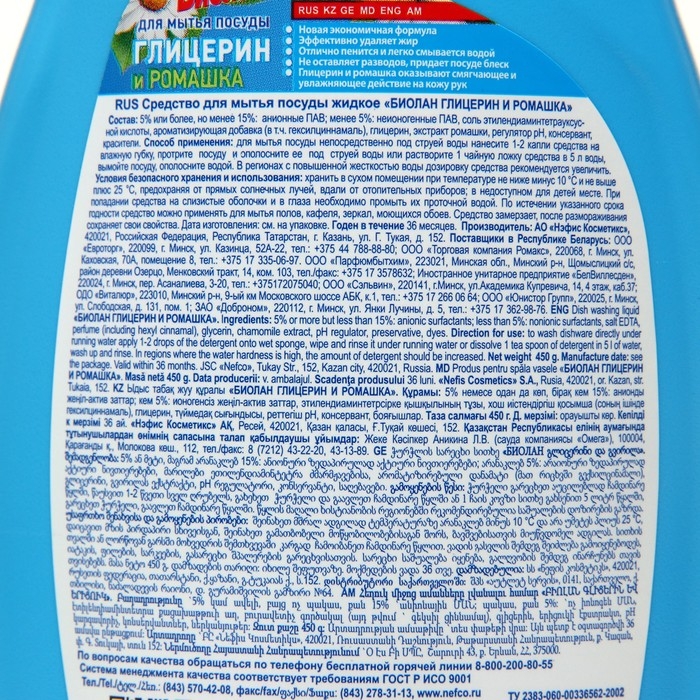 Средство для мытья посуды "Биолан - Ромашка", 450 мл
