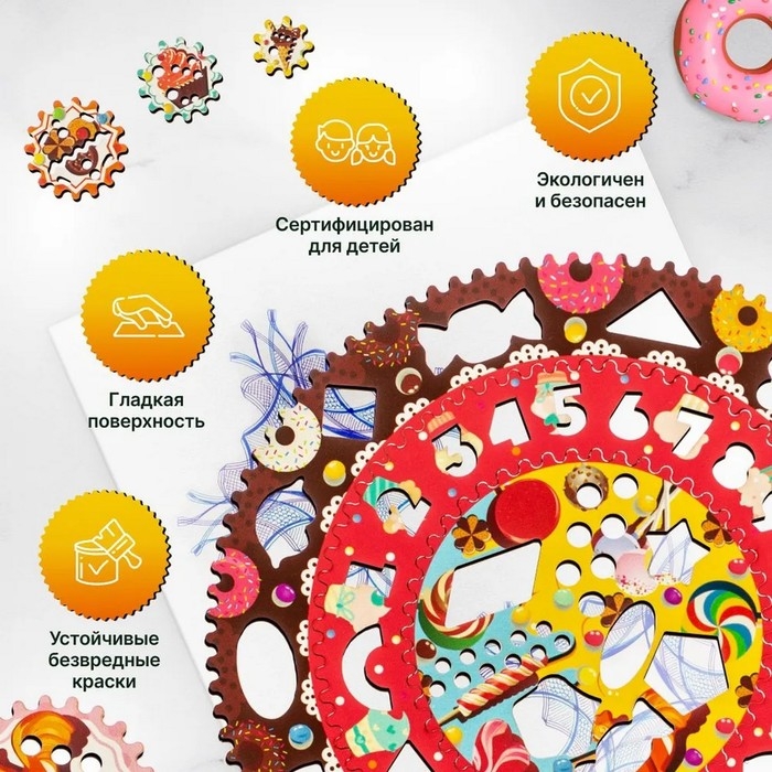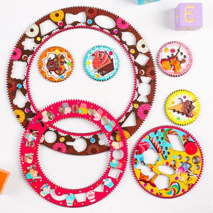 Спирограф — многофункциональная деревянная развивающая игрушка для рисования. Он имеет яркое оформление с тематическими изображениями, состоит из 2 зубчатых колёс с фигурными трафаретами и 5 кругов-шестерёнок.