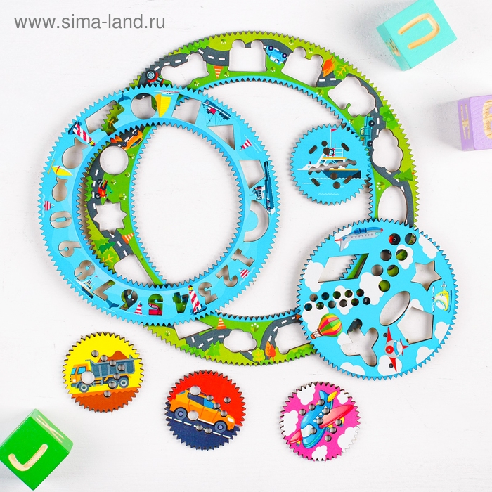 Спирограф — многофункциональная деревянная развивающая игрушка для рисования. Он имеет яркое оформление с тематическими изображениями, состоит из 2 зубчатых колёс с фигурными трафаретами и 5 кругов-шестерёнок.