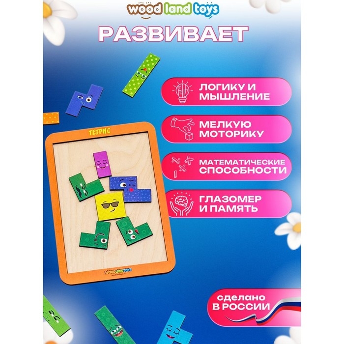 Тетрис — популярная развивающая игра. Она состоит из разноцветных фигурок разных форм. Игра с таким пазлом развивает у детей логическое мышление, мелкую моторику, математические способности, усидчивость и терпение. Задача ребёнка состоит в том, чтобы собрать все элементы тетриса без ошибок.