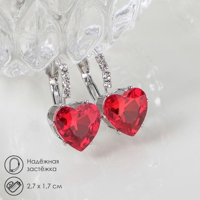 Серьги со стразами «Сердце» мерцание, цвет бело-красный в серебре