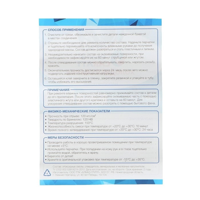 Клей предназначен для прочного и герметичного соединения деталей из металла, пластика, стекла, керамики, дерева и мрамора.