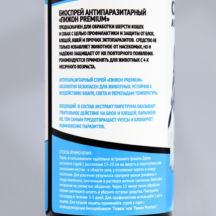 Биоспрей антипаразитарный «Пижон Premium» предназначен для обработки шерсти кошек и собак с целью профилактики и защиты от блох, клещей, вшей и прочих эктопаразитов.