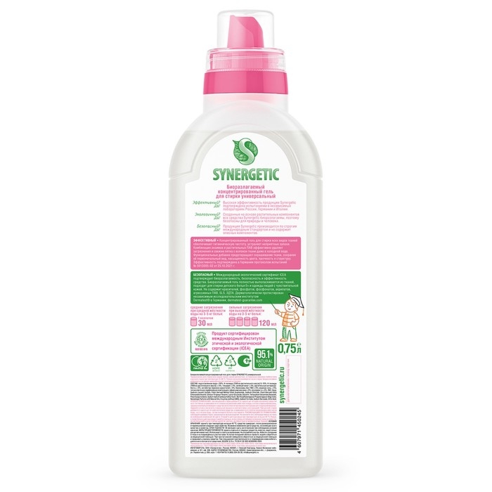Биоразлагаемый концентрированный гель для стирки SYNERGETIC универсальный обеспечивает бережное и эффективное очищение тканей, гигиеническую чистоту одежды и устраняет неприятные запахи. Комбинация энзимов и растительных ПАВ эффективно удаляет загрязнения и свежие пятна с волокон ткани даже в холодной воде.