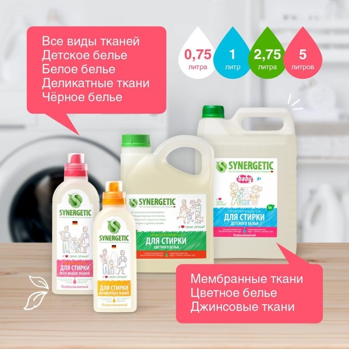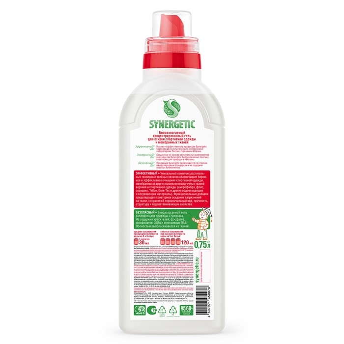 Биоразлагаемый концентрированный гель для стирки SYNERGETIC для для спортивной одежды и мембранных тканей предназначен для использования в стиральных машинах любого типа и ручной стирки при температуре 20 - 90 °C. Уникальный комплекс растительных тензидов и зеленых хелатов обеспечивает бережное и эффективное очищение мембранных и других высокотехнологичных тканей. Идеально подходит для стирки верхней и спортивной одежды из микрофибры, флиса, спандекса, тканей Teflon, Gore-Tex и других водоотводящих и согревающих материалов.