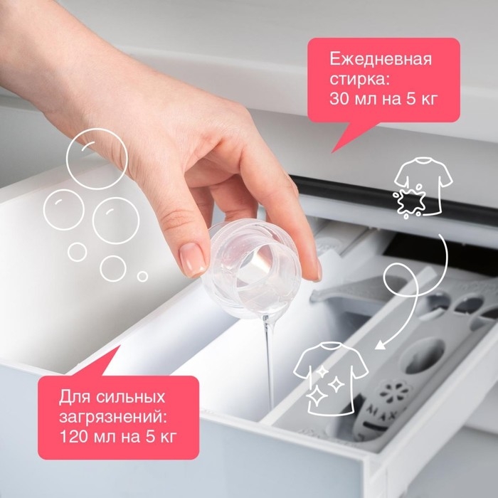 Биоразлагаемый гель полностью выполаскивается из тканей. Для автоматической стирки использовать от одного до четырех колпачков средства, в зависимости от степени загрязнения и жесткости воды. Для ручной стирки добавить средство в воду от одного до четырех колпачков на пять литров воды, в зависимости от степени загрязнения и жесткости воды. Соблюдайте режим стирки, указанный на ярлыке изделия. Не наносите гель непосредственно на ткань во избежание изменения ее цвета. Стирайте цветные вещи при температуре не выше 40 °C. Новые, а также белые и цветные вещи стирайте отдельно, если степень устойчивости окраски ткани не известна.