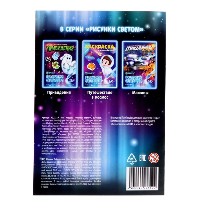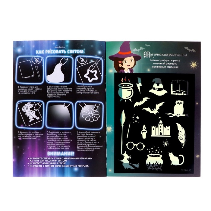 С помощью активити-книжки и специального маркера ребёнок научится рисовать светом. Малыш будет создавать картинки, используя трафареты, или придумает собственные сюжеты.